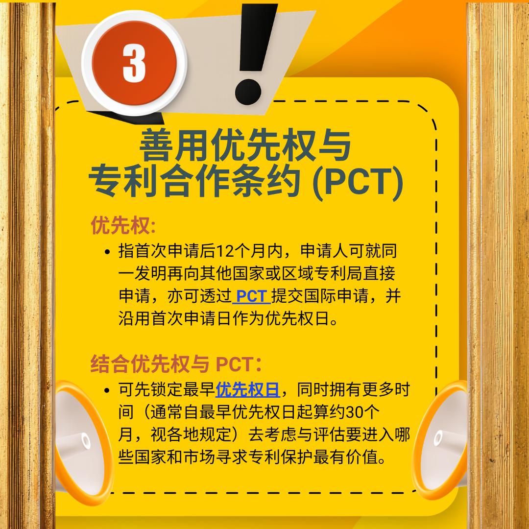 【IP小知识】国际专利布局(二):善用PCT IP小知识 二〇二六年四月八日 点击数:77 拓展海外市场,专利布局策略同样重要!除了用《巴黎公约》申请优先权之外,还有方法可以用一份申请覆盖超过150个国家。本期与您分享怎样一次性锁定多个目标市场,争取时间又省成本: 上一篇文章: 【IP小知识】专利分类号是专利检索的“秘密武器” 上一页 下一篇文章: 【IP小知识】国际专利布局(一):善用优先权 下一页