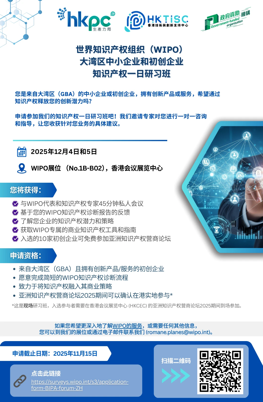 世界知识产权组织(WIPO) 大湾区中小企业和初创企业 知识产权一日研习班 最新消息及活动 二〇二五年十一月十日 点击数:62 上一篇文章: HKTISC将参展2025年亚洲知识产权营商论坛 上一页 下一篇文章: 【HKTISC知识产权培训】专利对发展大湾区业务的重要性 下一页