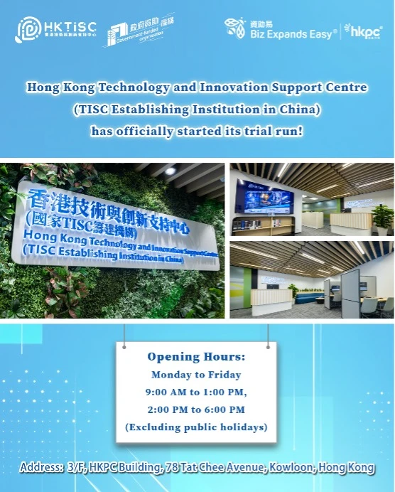 The Hong Kong Productivity Council has been designated jointly by the China National Intellectual Property Administration and the World Intellectual Property Organization as Hong Kong’s first establishing institution of Technology and Innovation Support Centre (TISC). The physical centre of the Hong Kong Technology and Innovation Support Centre (TISC Establishing Institution in China) has officially started trial run, providing basic intellectual property support services to the public and innovators, helping you easily access innovation resources and protect your technological achievements!