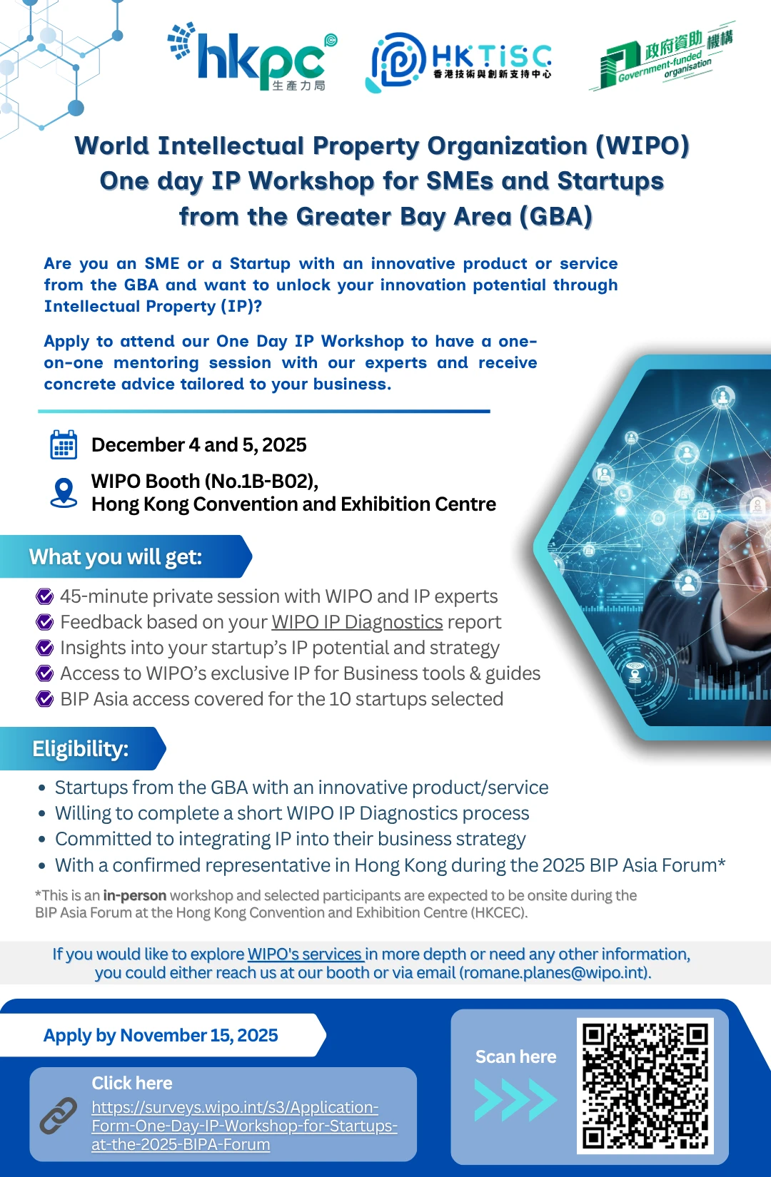 World Intellectual Property Organization (WIPO) One day IP Workshop for SMEs and Startups from the Greater Bay Area (GBA) News & Events 10 November 2025 Hits: 170 Previous article: HKTISC will be exhibiting at BIP Asia 2025 Prev Next article: [HKTISC IP Training] The Importance of Patents in Developing Greater Bay Area Business Next